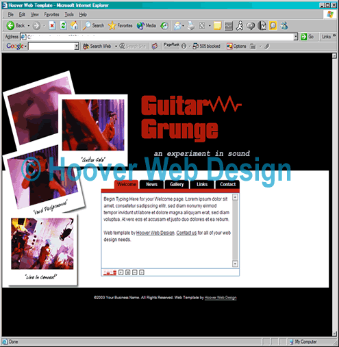This cool flash web template is for a rock music bands web site. A Flash animated girl dances to the music and a rock song plays in the background. There is a Macromedia Flash animated text box with tabs that holds the web site's content. You can specify 5 page names on the template. This scrollable text box accepts basic html (sorry, no pictures). The text box also plays music, has a sound off and on buttons and volume controllers. There is a tiny equalizer that moves up and down with the beat on the text box. There are stock images of a rock band included as Polaroid photographs in the template. (In order to use your own band photos you will need to have the template customized) A graphic editor is needed to add your site name and logo on the top banner. Basic Instructions, are included. The Flash source file is not included. There is no link back requirement or link removal fee on this template. We recommend purchasing this photo gallery with this music web template. View more music web templates.